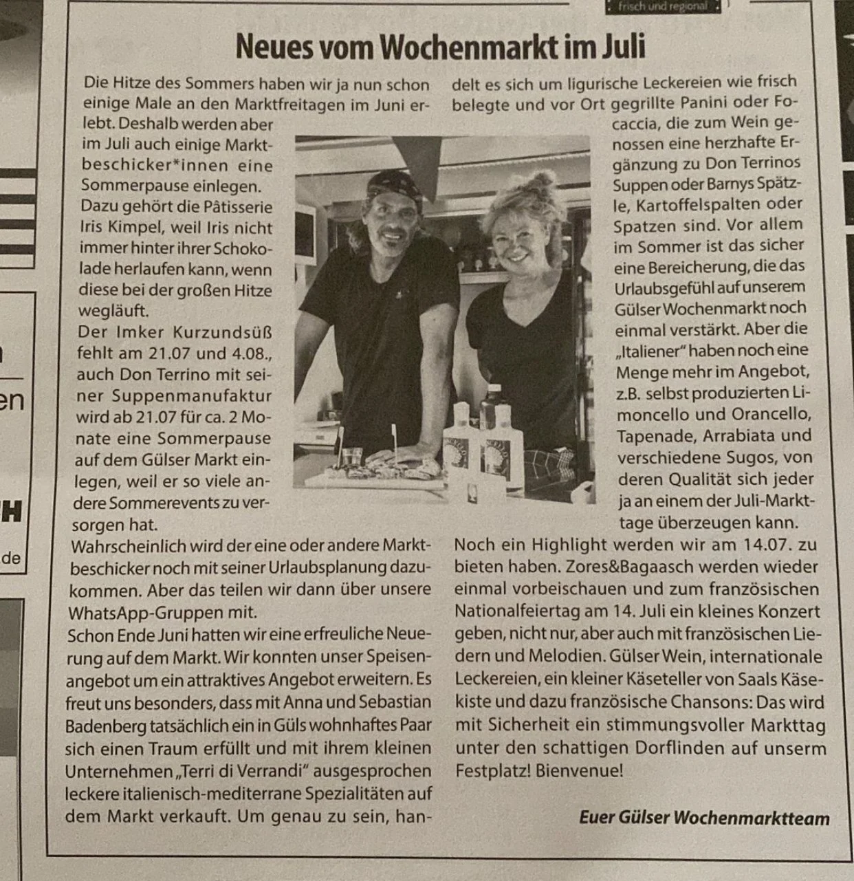Das ist ein schöner Artikel über unseren Start auf dem Gülser Wochenmarkt, der im hiesigen Wochenblatt über uns erschienen ist…