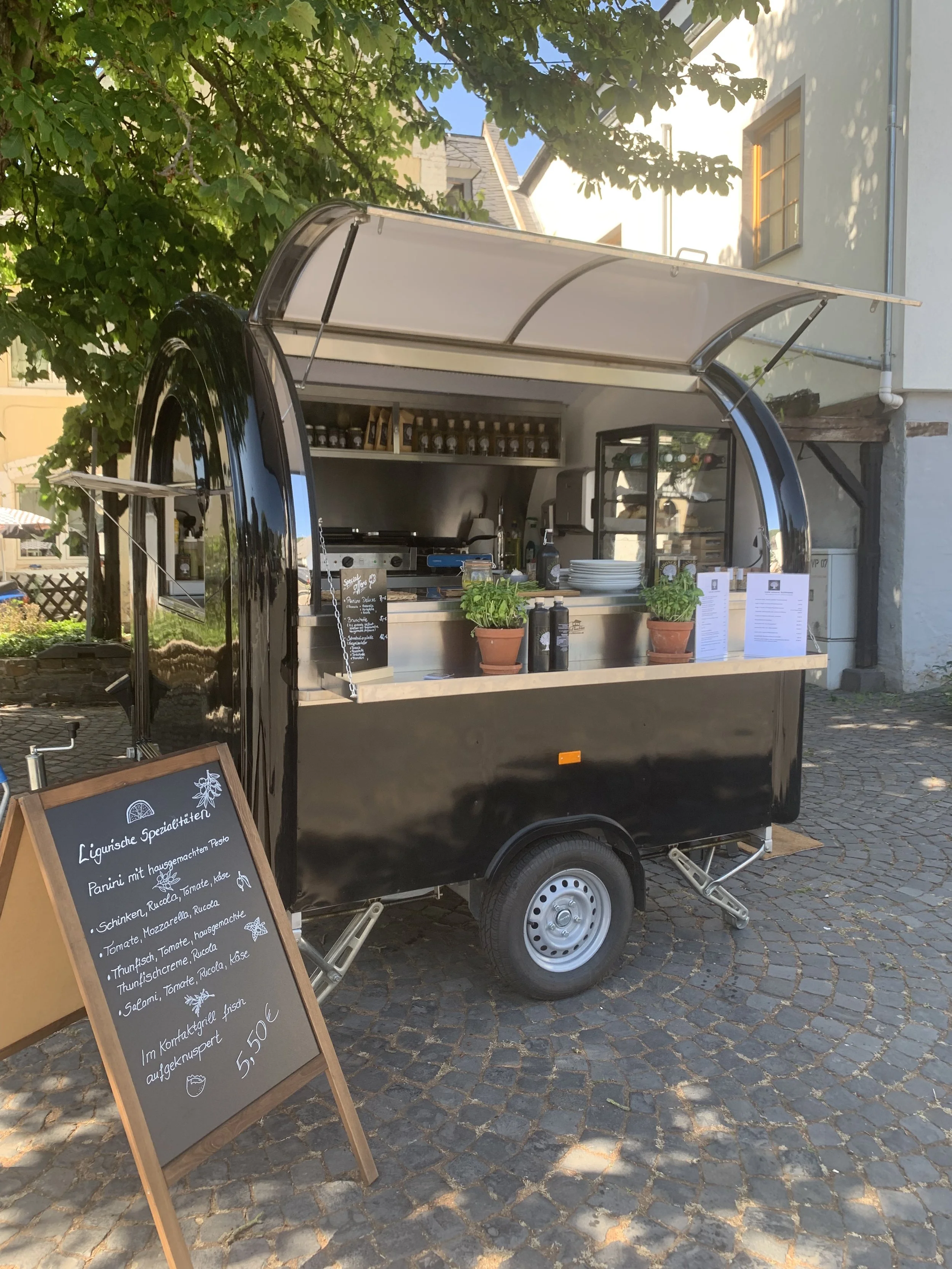 Das ist unser kleiner, schwarzer Anhänger. Hiermit stehen wir auf den Wochenmärkten in Koblenz, um den Kunden unsere Produkte vorzustellen. Wir haben den Anhänger mit einem Doppel-Kontaktgrill ausgestattet, so dass wir frisch belegte Panini zubereiten können. Außerdem verfügt der Anhänger über eine Kühltheke, einen Kühlschrank und eine Doppelfritteuse, um unsere Arancini, Panzerotti und Trüffel-Pommes zuzubereiten.